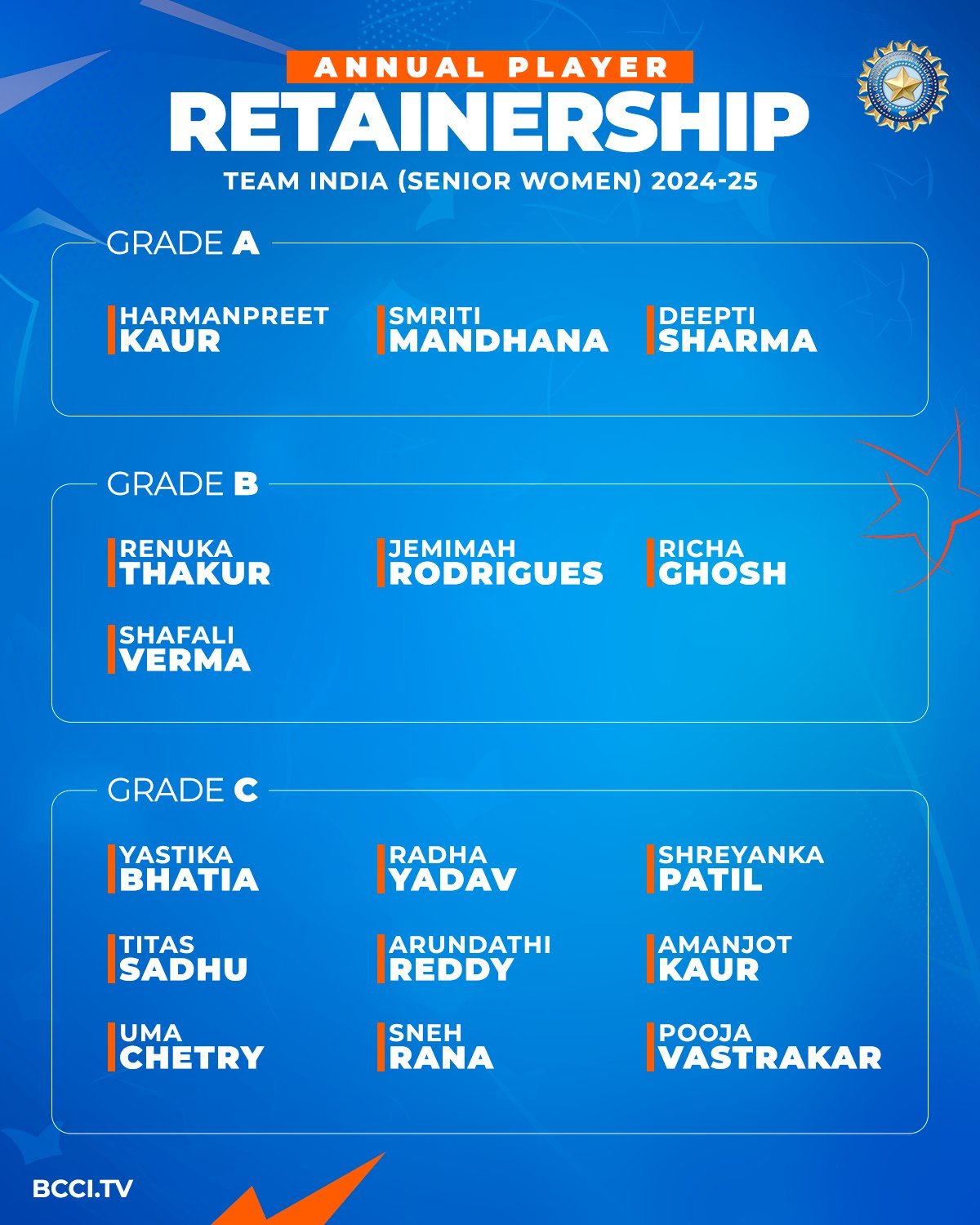 The Board of Control for Cricket in India (BCCI) has announced the retainership for the Indian Women’s team for the 2024-25 season, covering the period from October 1, 2024 to September 30, 2025.
